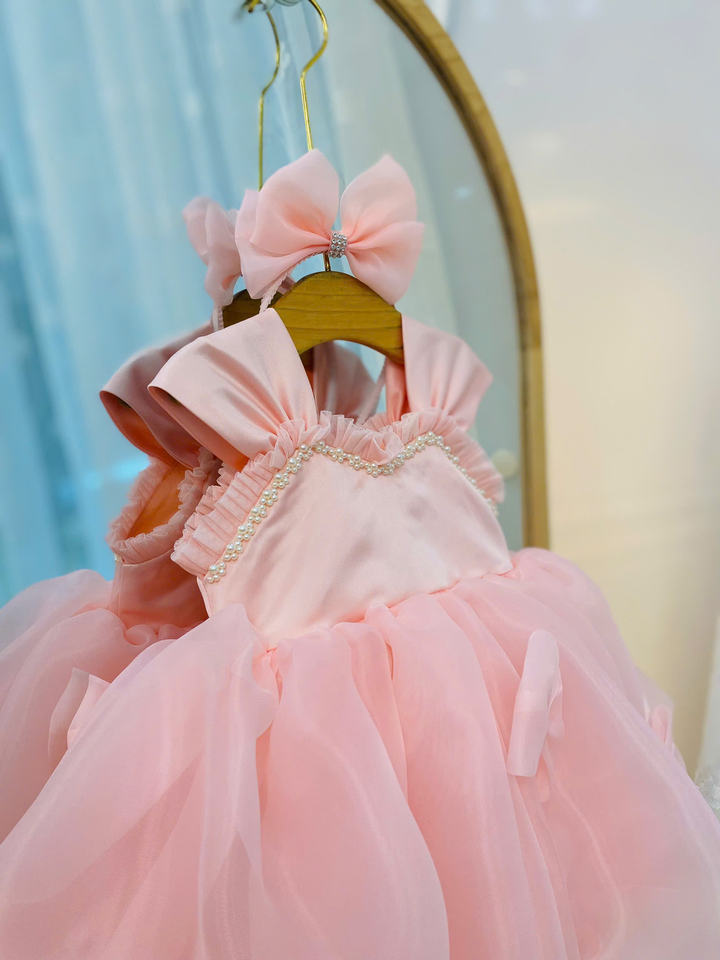 Pink Casual Kids Party Dress Bows Beading Maxi Sleeveless Halter Design Many Occasions Birthday Performancing ODM/OEM Supported