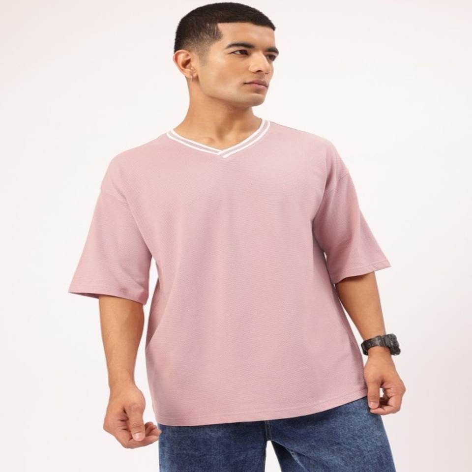 Pink Color Men's T-shirt Comfortably-Stylish Drop Shoulder Half Sleeves, V-Neck Textured Relax Oversized T-shirt For Men
