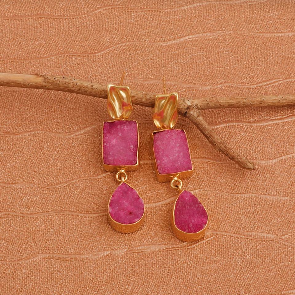 Pink Druzy Gold Plated Cute Women's Statement Stud Earrings Double Druzy Gemstone Collet Set Boho Textured Earrings