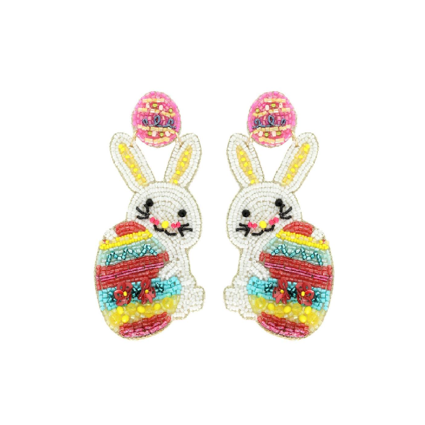 Pink Easter Bunny Handcrafted Beaded Earrings Cute Handmade Holiday Jewelry Festive Rabbit Dangle Earrings Hoop Earings
