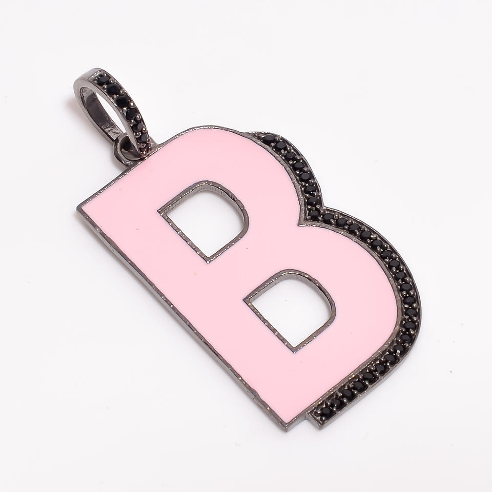Pink Enamel Letter B Pendant CZ Outline Alphabet Initial Charm In Silver Finish Personalized Jewelry