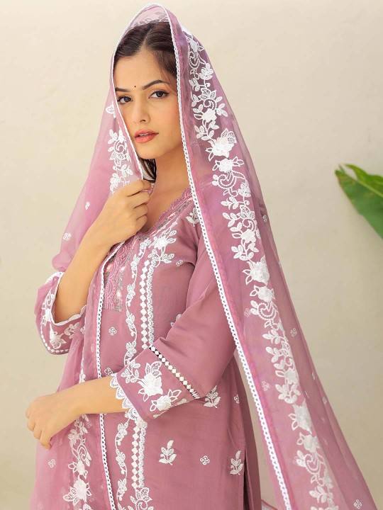 Pink Floral Embroidered Regular Pure Silk Kurta With Trouser With Dupatta