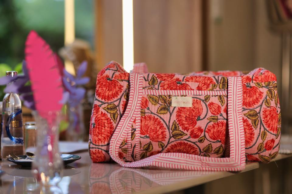 Pink Floral Hand Block Printed Cotton Duffle Bag Handmade Indian Travel Tote Lightweight Ecofriendly Weekender Bag