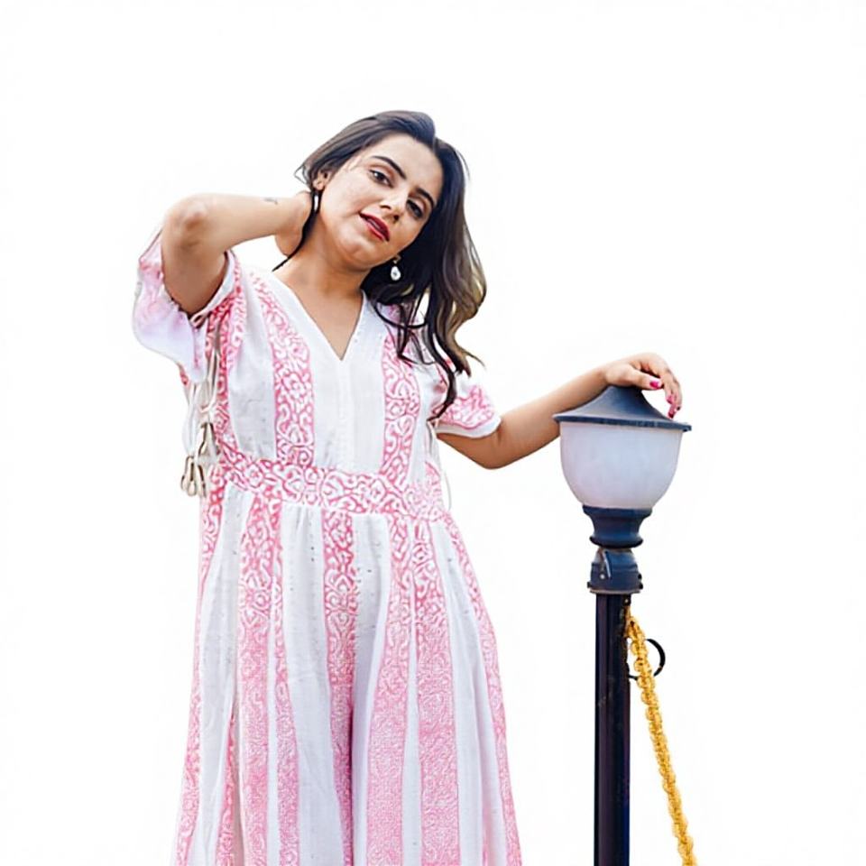 Pink Floral Printed Digital Printing Boho Midi Dress Soft Cotton Feel Summer Long V-Neck Casual Beach Gown