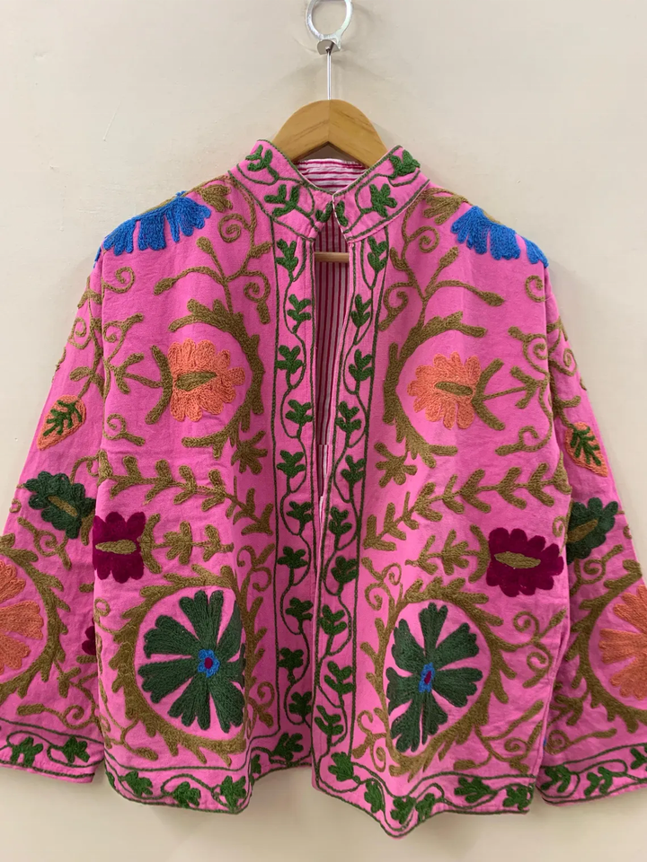 Pink Floral Velvet Suzani Hand Embroidered Bomber Coat Jacket Collared Tailored Winter Wear Breathable Hippie Style