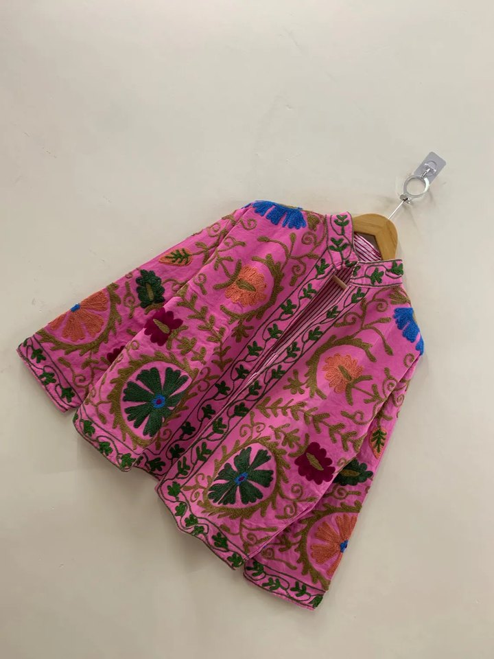 Pink Floral Velvet Suzani Jacket Hand Embroidered Collared Tailored Bomber Coat Summer Hippie Style Printed Technics Button