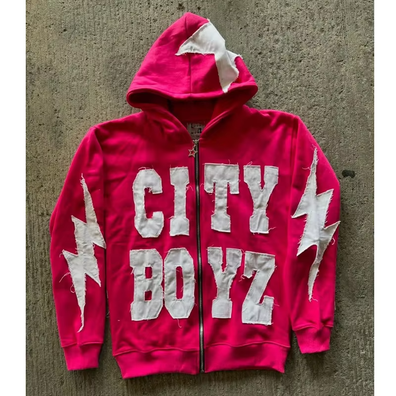 Pink Full Zip Up Hoodie "CITY BOYZ" Patchwork Lightning Bolt Y2K Oversized Streetwear Jacket