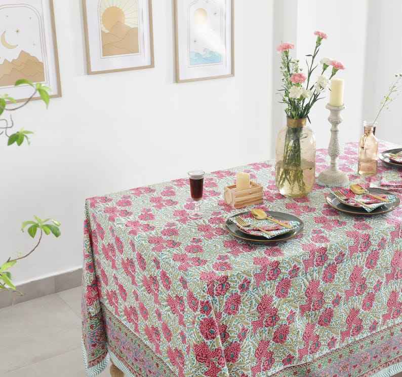 Pink Green Floral Block Print Cotton Tablecloth Indian Table Cover Handmade Table Linen Set Wedding Table Decor