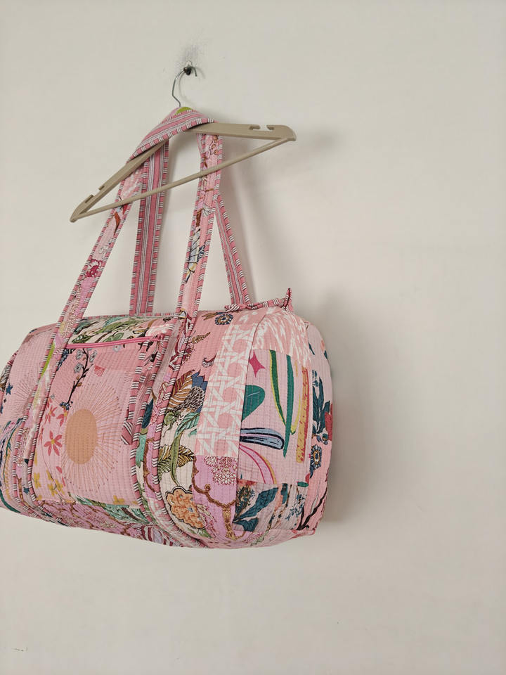 Pink Handcrafted Floral Quilted Duffle Bag Vibrant Blue Patchwork Boho Travel Tote with Vintage Charm Casual Artisan Touch