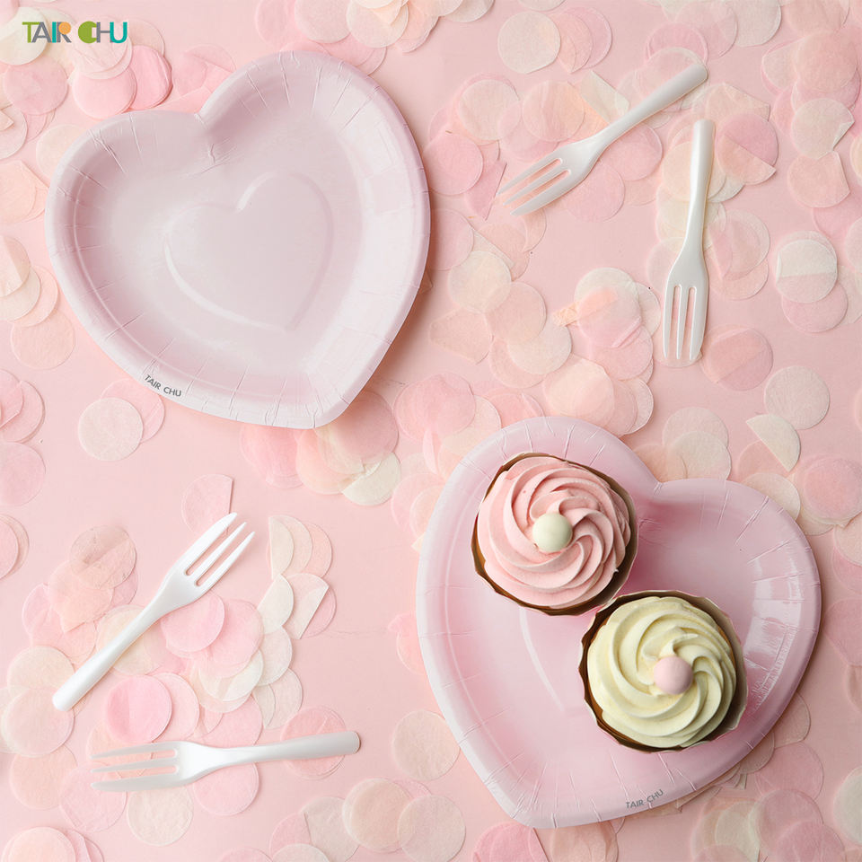 Pink Heart-Shaped Cake Paper Plate with 10cm Mini Fork Disposable Wedding Favors for Party