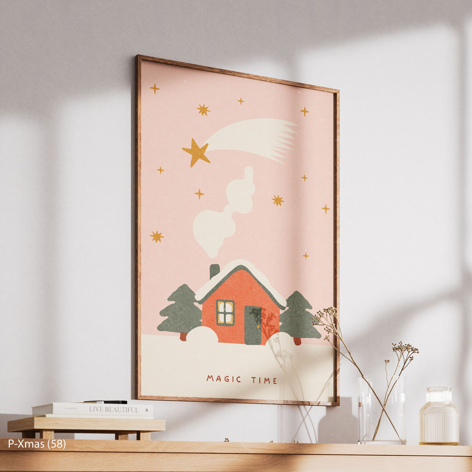 Pink 'Magic Time' Cottage and Shooting Star Modern Canvas Wall Art with Wood Frame Ready to Hang