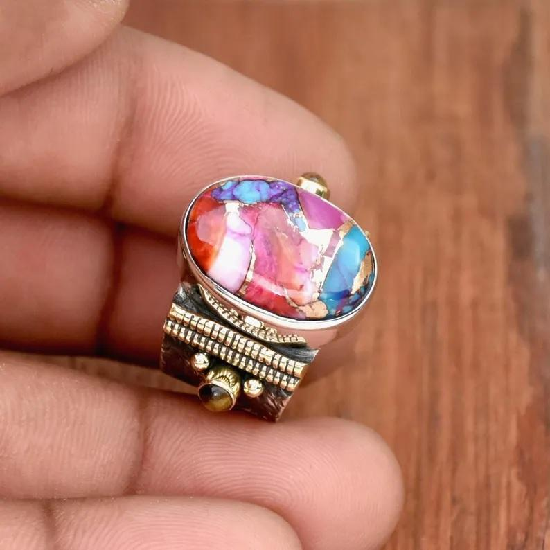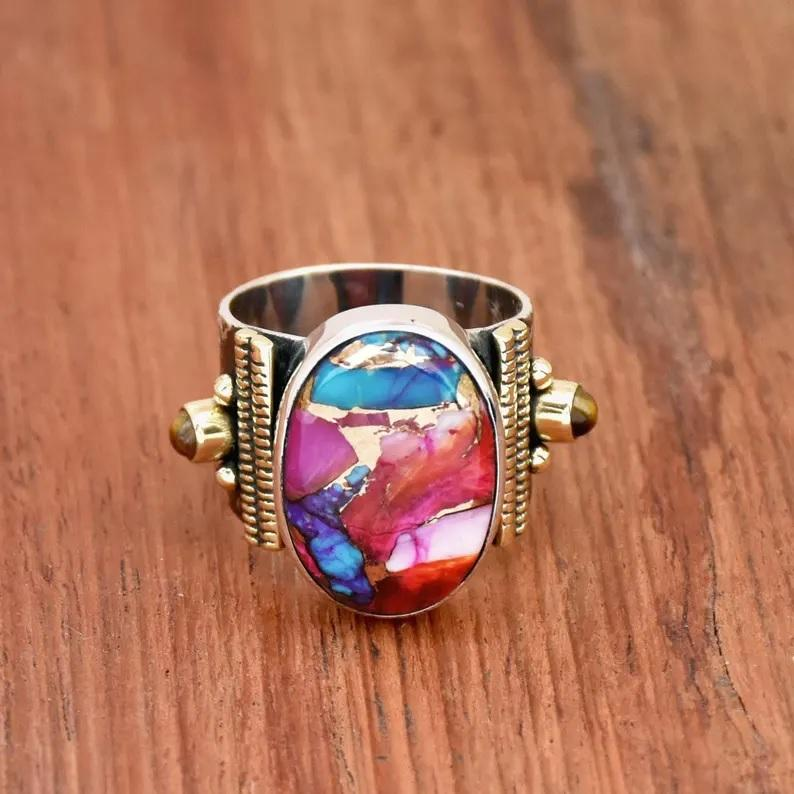 Pink Oyster Turquoise and Tiger Eye Ring 925 Sterling Silver Two Tone Floral Band Statement Gift Ring for Women