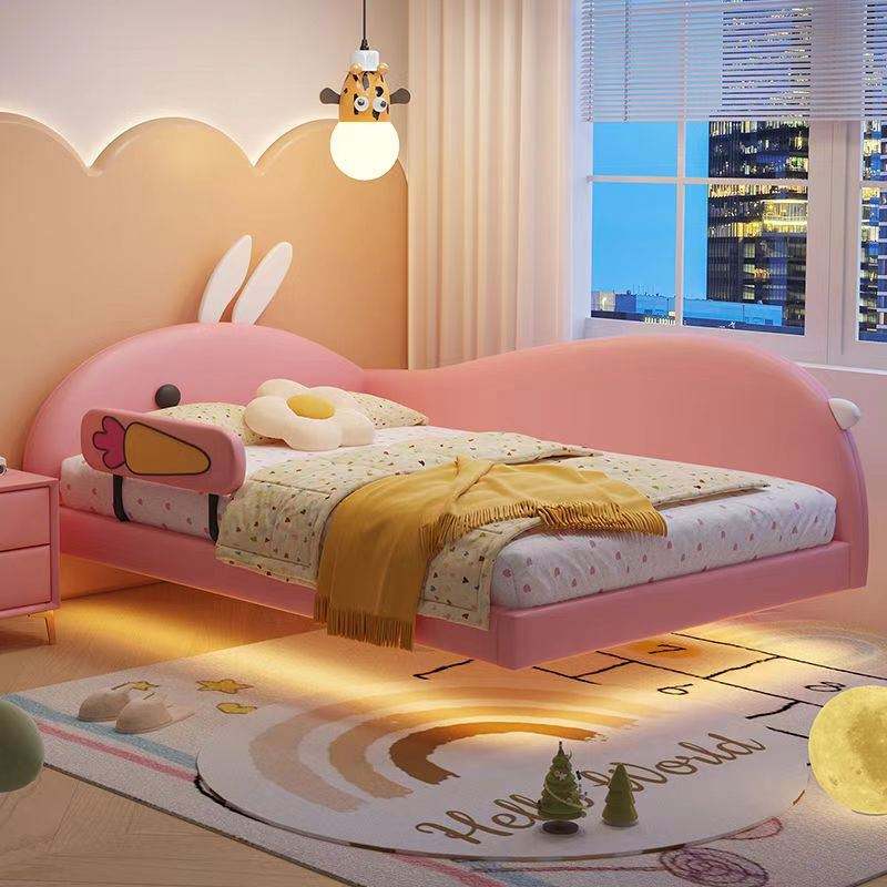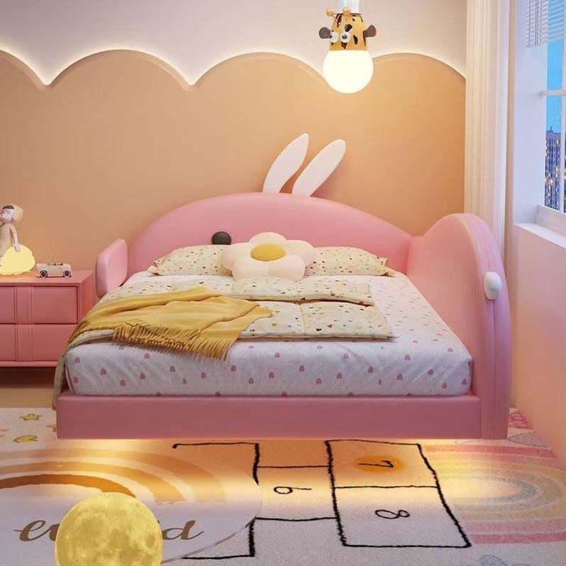 Pink Princess Rabbit Bed Solid Wood Floating Frame Soft Upholstery LED Light Guardrail Modern Girls Bedroom