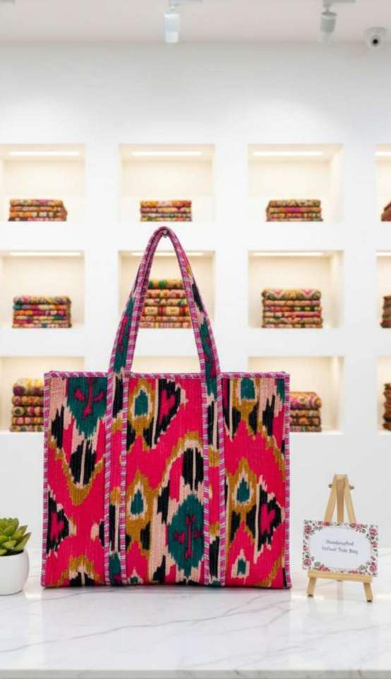 Pink Printed Customized Reversible Bohemian Vintage Fashion Velvet Lightweight 18" Shopping Travel Bag Canvas Lining Zipper All