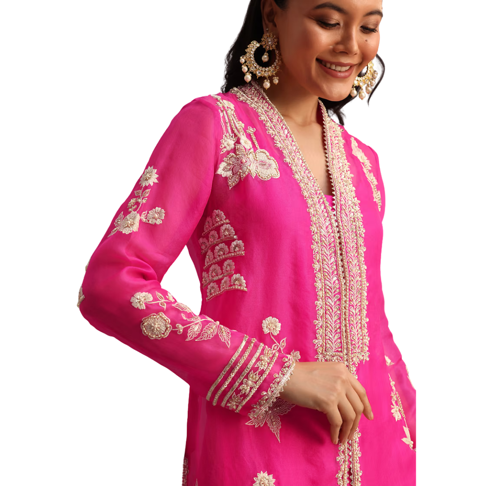 Pink Resham Work Kurti Palazzo Suit Wholesale Women Ethnic Apparel OEM Clothing Factory Supplier Custom Party Wear Outfit