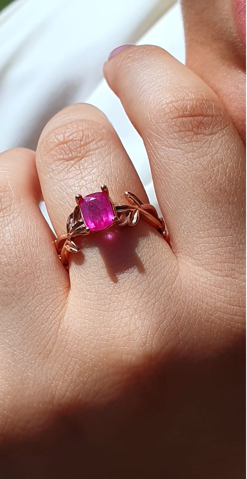Pink Sapphire Engagement Ring Elongated Cushion Cut Diamond Ring Leaves Ring CZ Diamond Twig and Leaf Nature Inspired Vintage