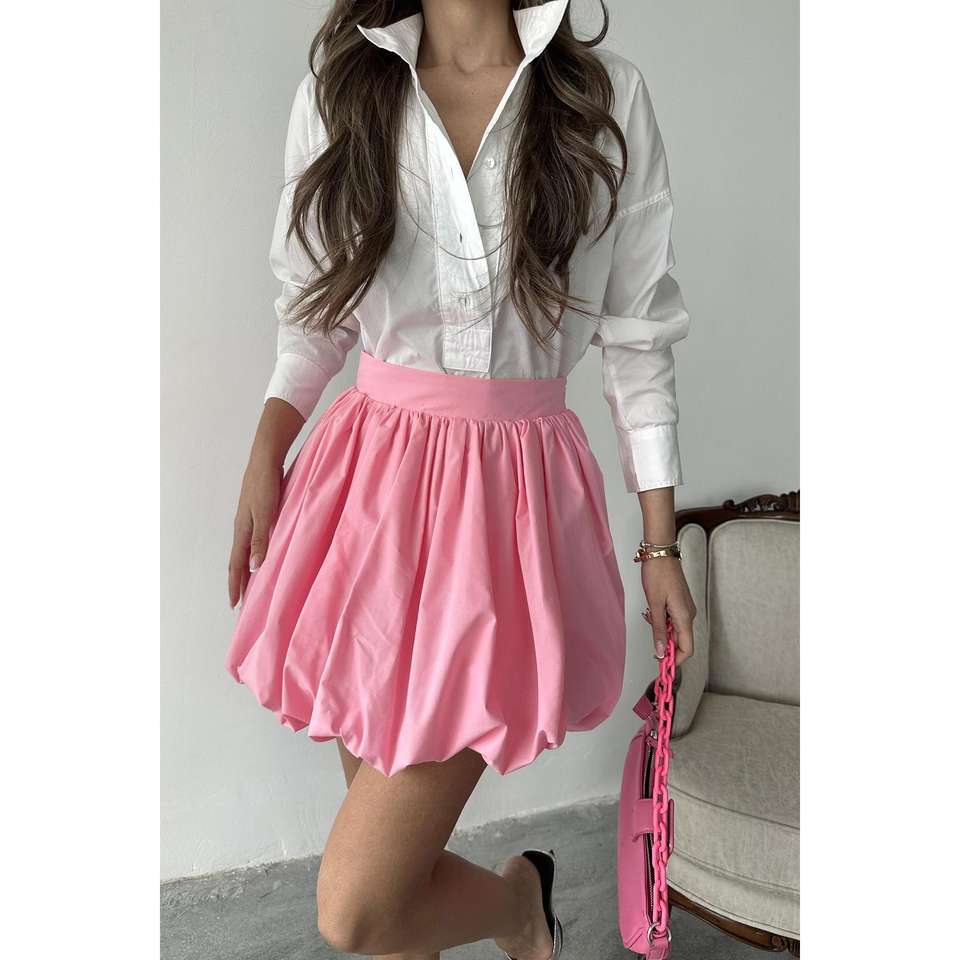 Pink Satin Balloon Skirt Women Elastic Waist Soft Fabric 100 Polyester High Waisted Flared Mini Skirt For Daily Wear