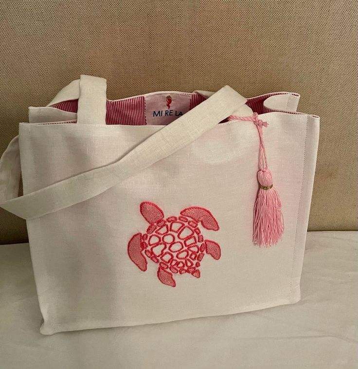Pink Sea Turtle Embroidery Linen Handbag Large Capacity Shoulder Travel Bag Women Summer Beach Vacation Tassel Canvas Tote Purse