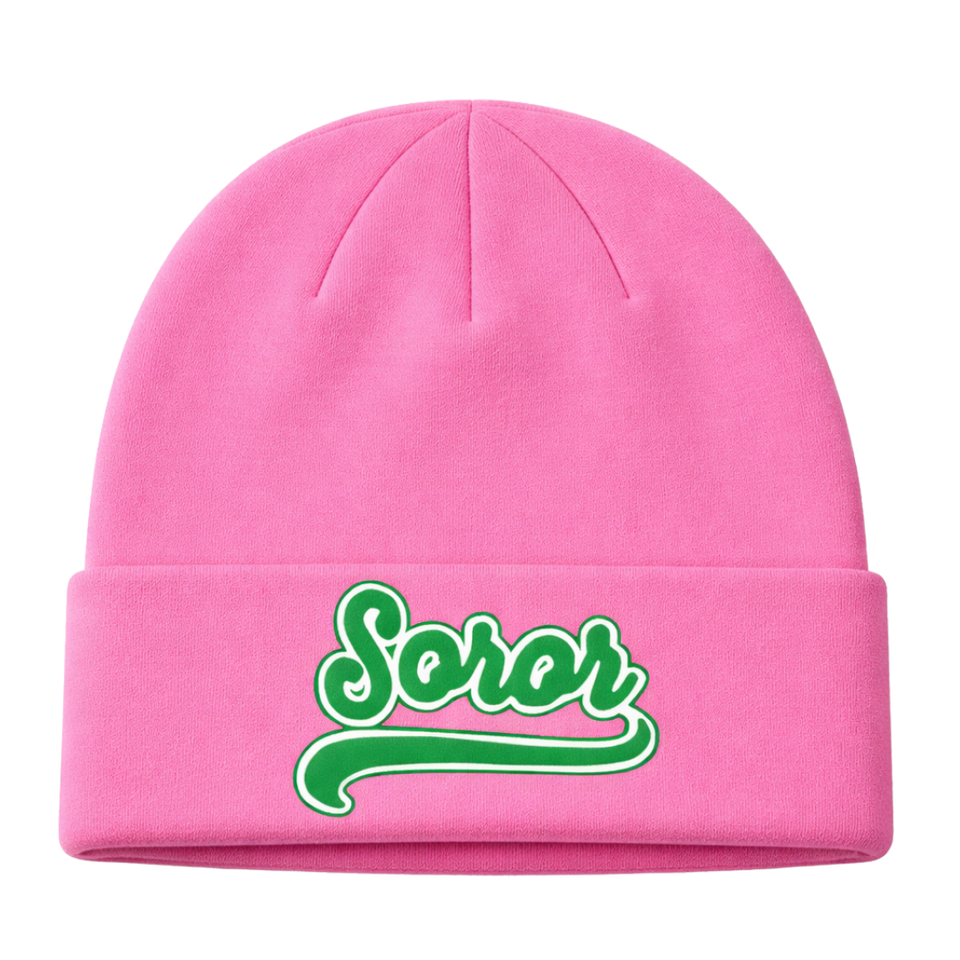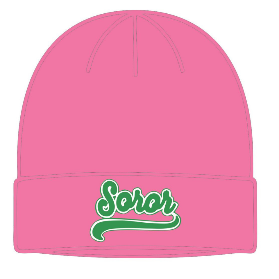 Pink Soror Beanie Hat Greek Sorority Womens Pink & Green College Sisterhood Winter Knit Stylish Casual Apparel