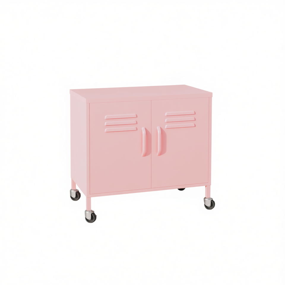 Pink Steel Rectangular Storage Cabinet Compact Living Room Furniture With Wheels Modern Minimalist Design