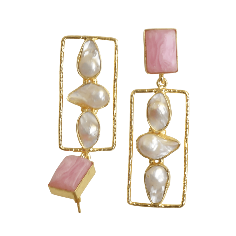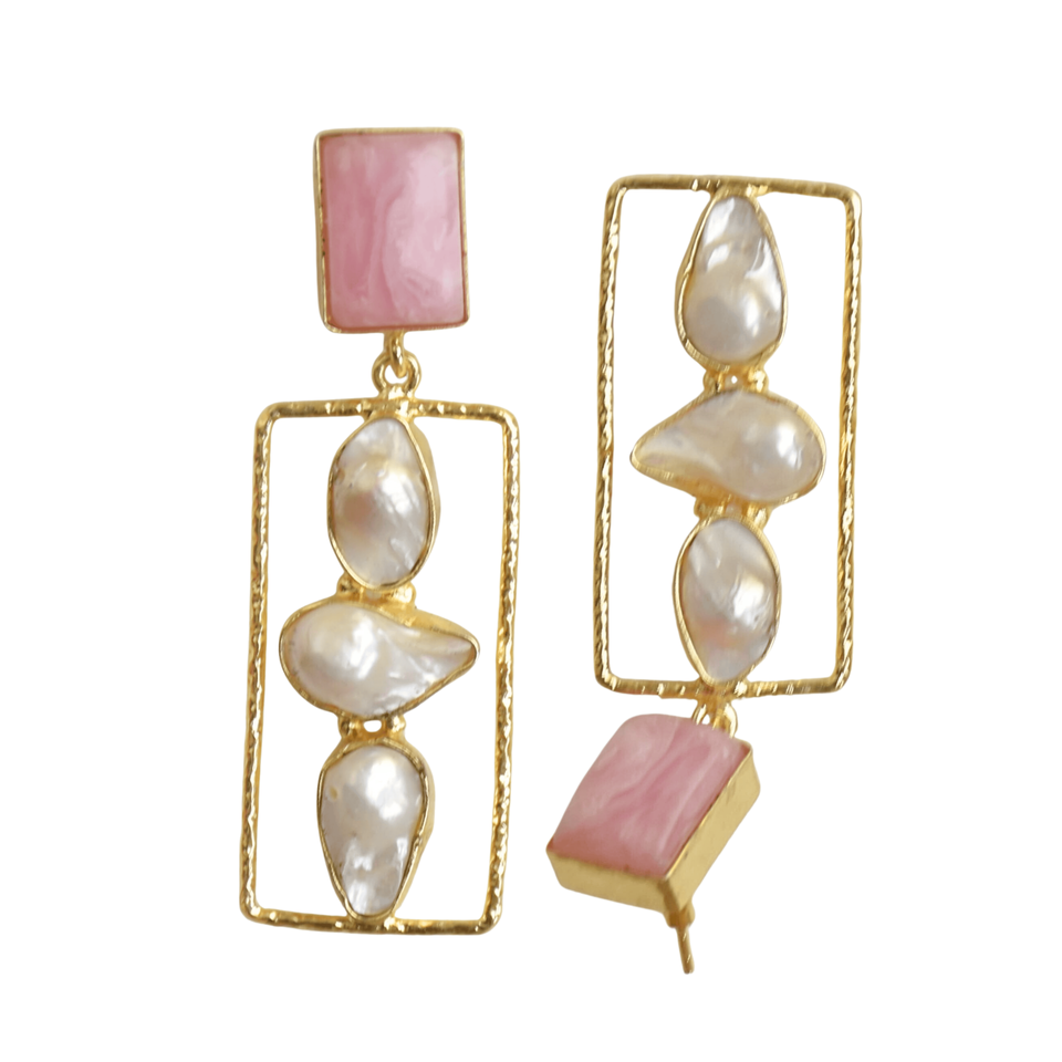 Natural Brass Drop Earrings Premium Pearl Natural Semi Precious Stone High Polish Gold Plated Unique Designer Pattern Ready