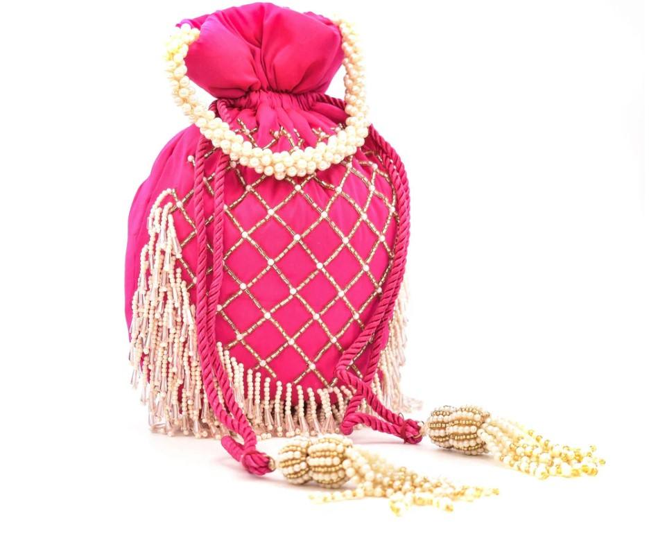 Pink Striped Designer Embroidered Fabric Potli Bag Satin Lined Satchel Wedding Thank You Favors