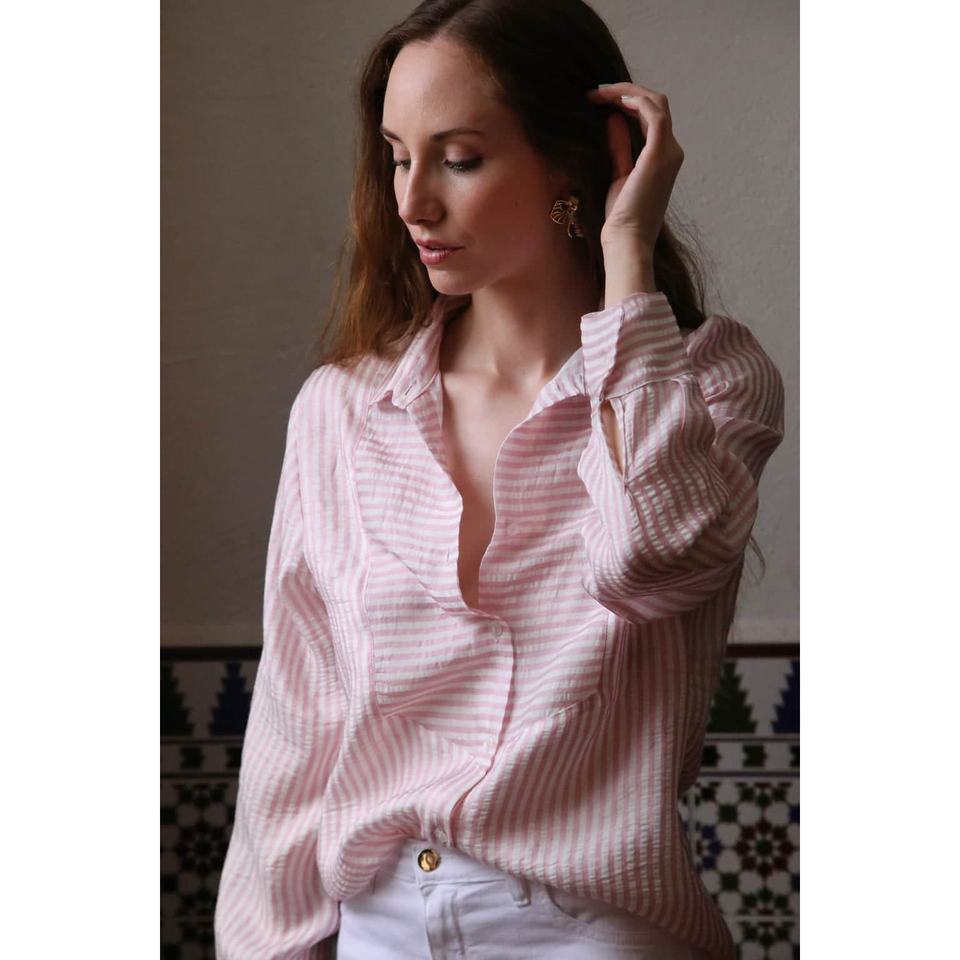 Pink Stripes Asymmetrical Collar Blouse Ladies' Formal Silk Poplin Top Embroidered Logo Trendy XL Size for Autumn Office Wear