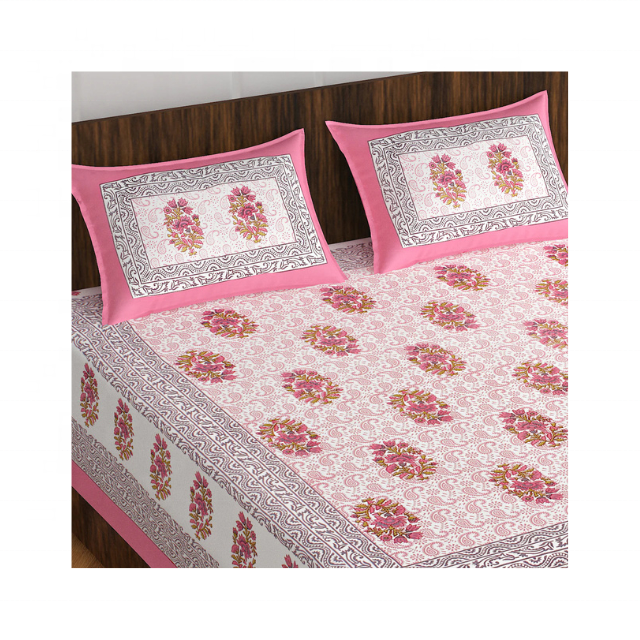 Pink Sustainable 100% Cotton Embroidered Queen Bed Linen Made In India With GOTS Certified Organic Fabric And Floral Block Print