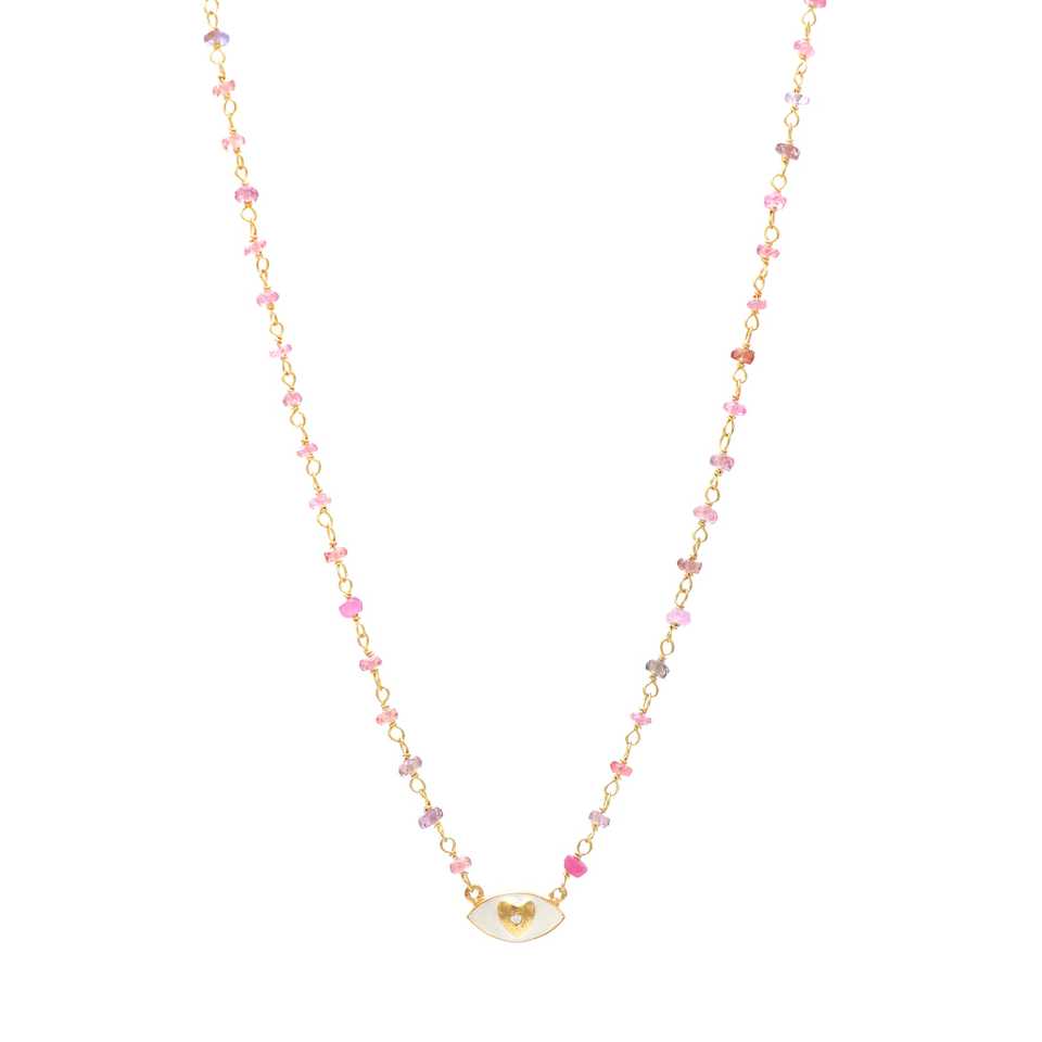 Pink Tourmaline Beaded Necklace With White Enamel Heart Charm in Gold Plated 925 Sterling Silver