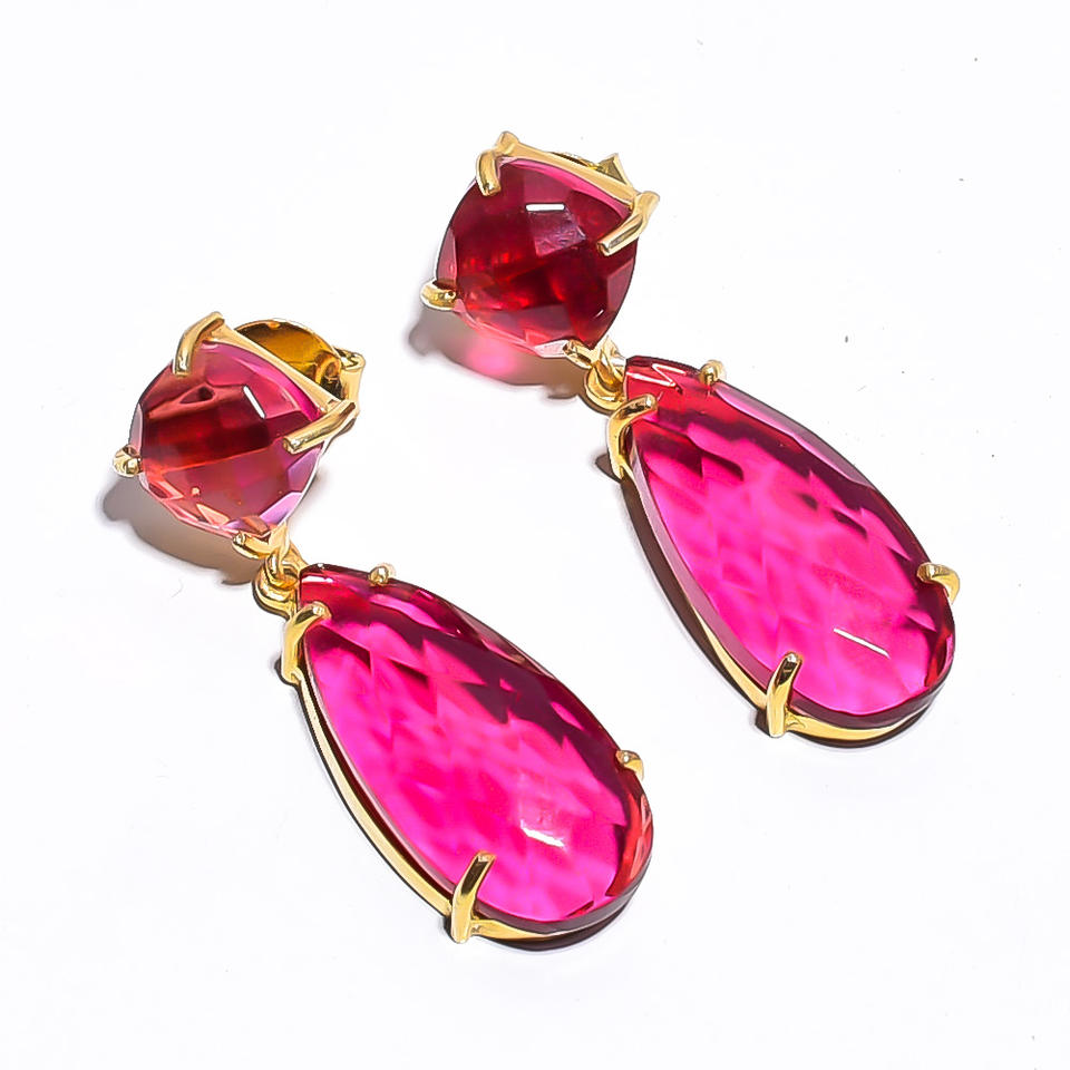 Hot Pink Crystal Dangle Post Gold Plated Bridal Statement Long Pink Tourmaline Quartz Prong Set Women 925 Sterling Earring