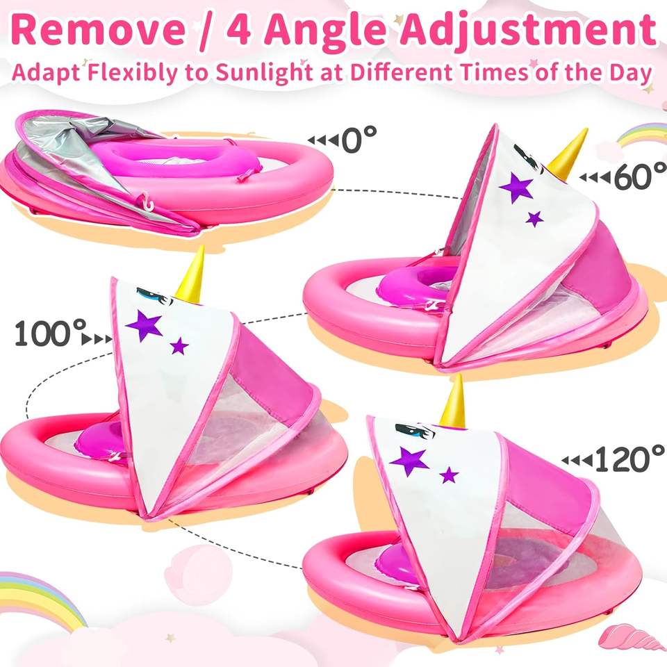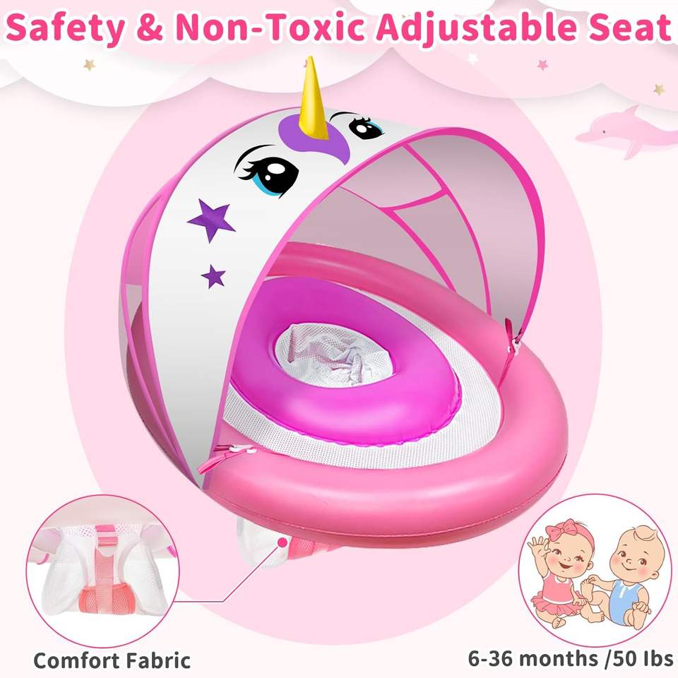 Pink Unicorn Baby Pool Float with Canopy UPF 50+ Sun Protection, Inflatable Toddler Float for Ages 6-36 Months,