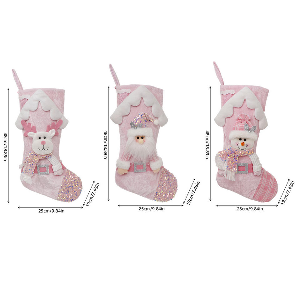 Pink Velvet Christmas Stockings Cute Santa Reindeer Snowman Characters with Glitter Sequins Festive Xmas Socks Gift Storage