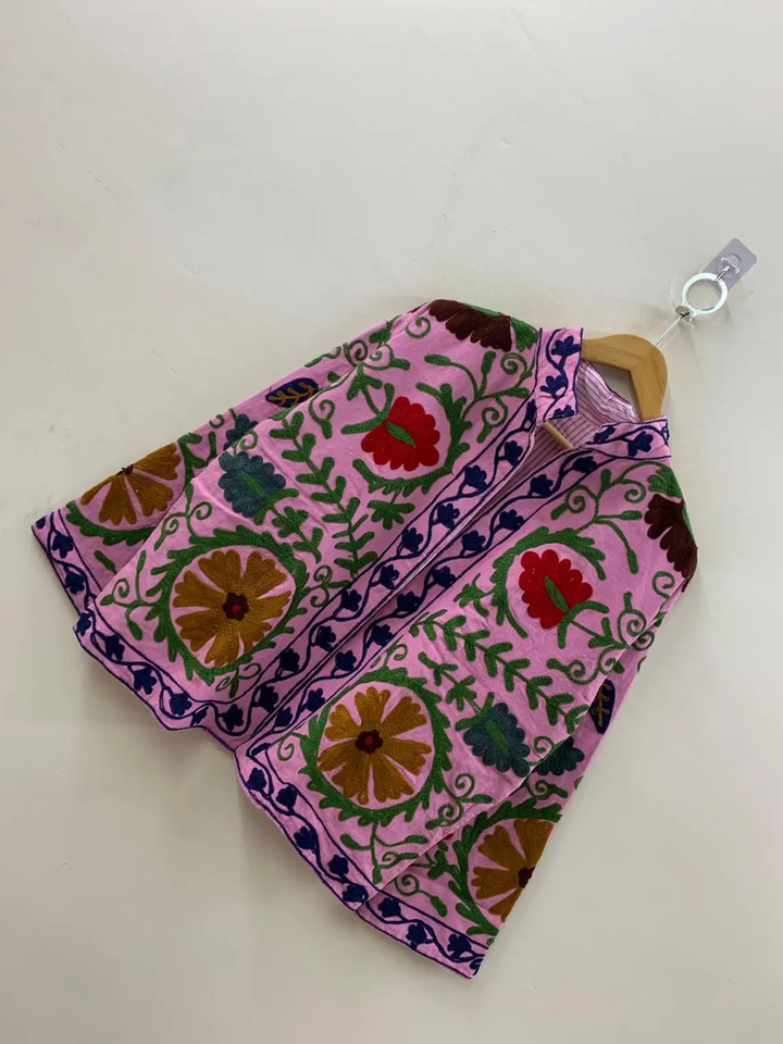 Pink Velvet Suzani Hand Embroidered Jacket Floral Printed Collared Tailored Bomber Coat Trendy Hippie Summer Jacket