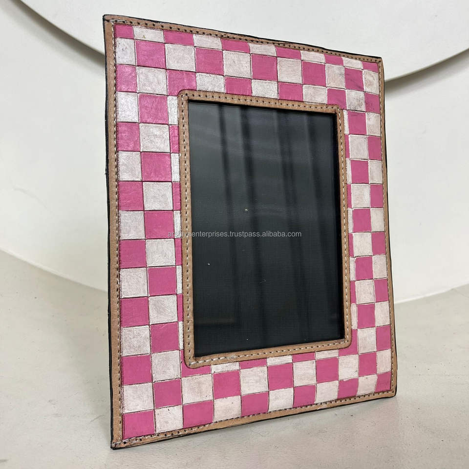 Pink & White Checkerboard Photo Frame Modern Hand Tooled Leather Decorative Desk Frame Wholesale Home Decor Customizable Sizes