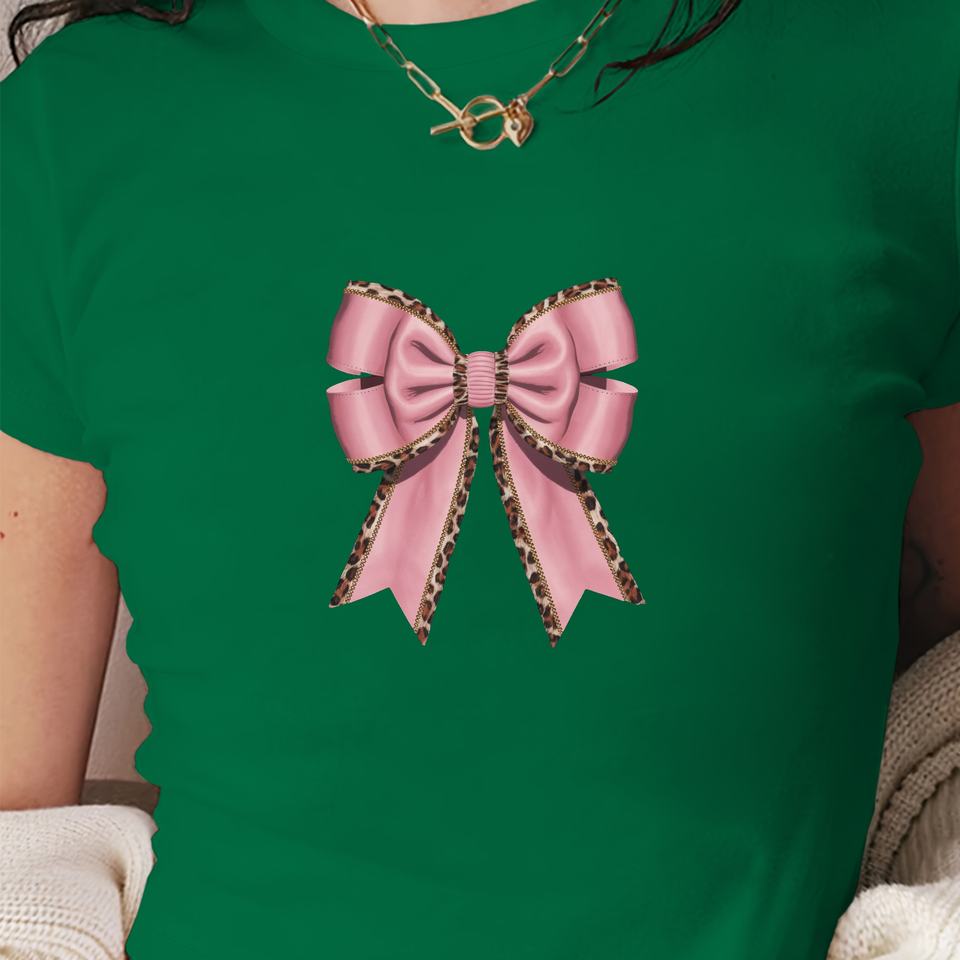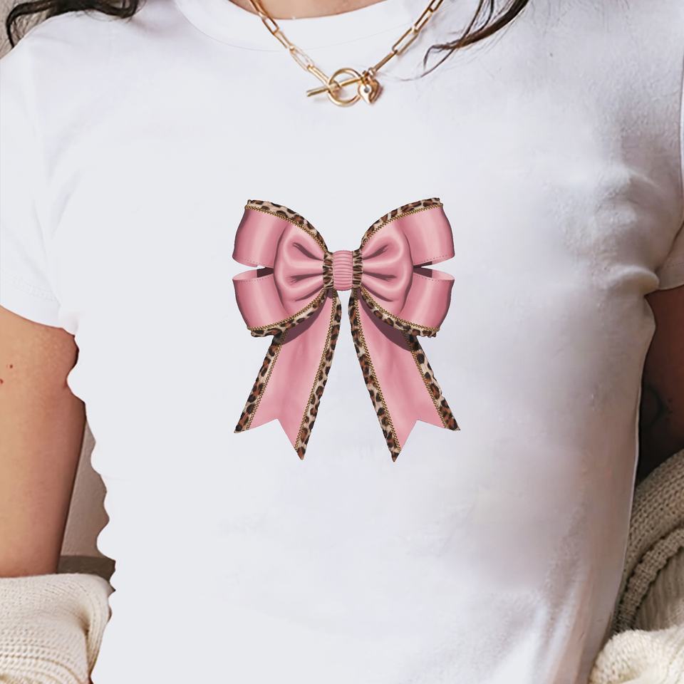 Pink bow with leopard print women's fashion short t-shirt