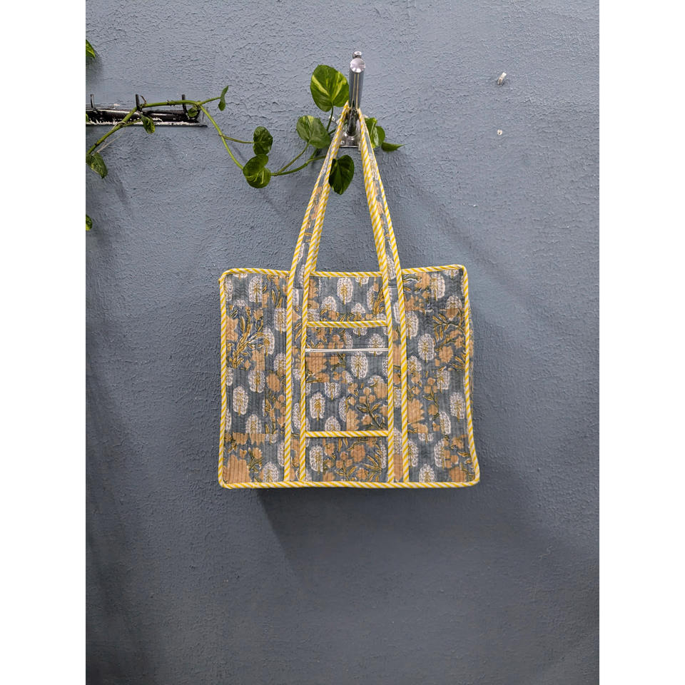 Pinksa Fashion Handmade Indian Cotton Block Print Quilted Zipper Closure Shoulder Shopping Tote Bag with Pockets for Women