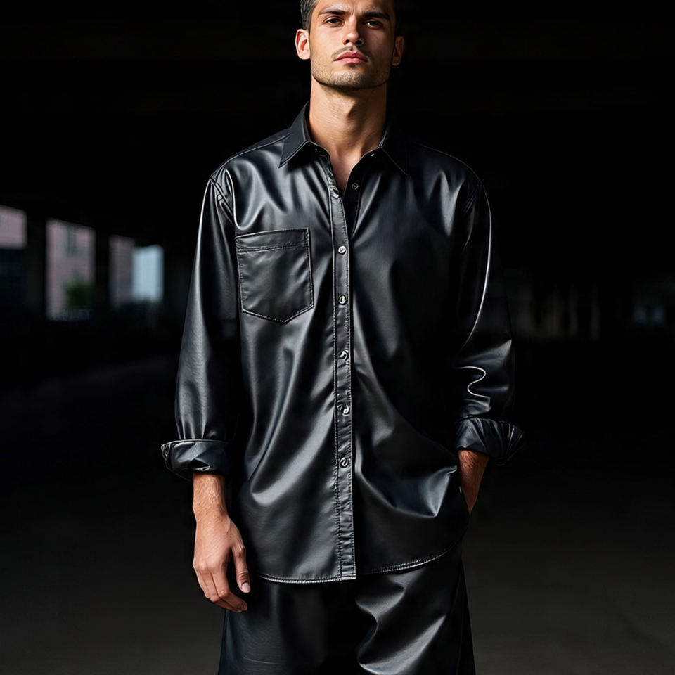 Plain Genuine Leather Shirts Men Turn Down Collar Button Down Cow Leather Shirts Boys High Streetwear Plain Leather Shirt Men's
