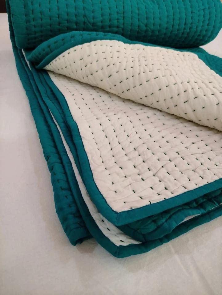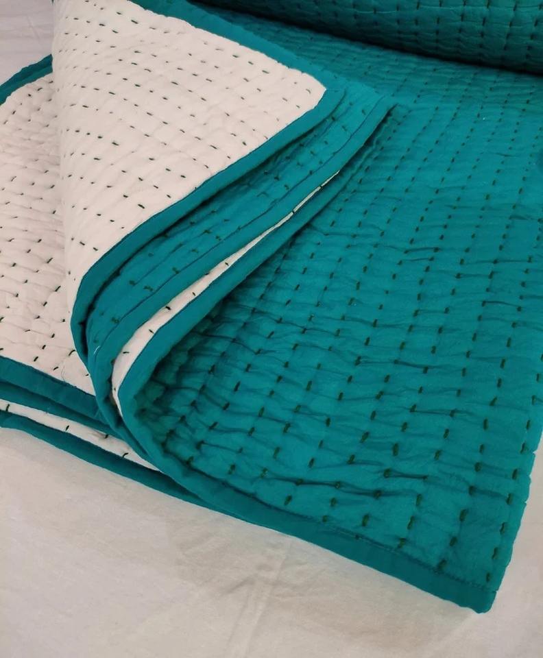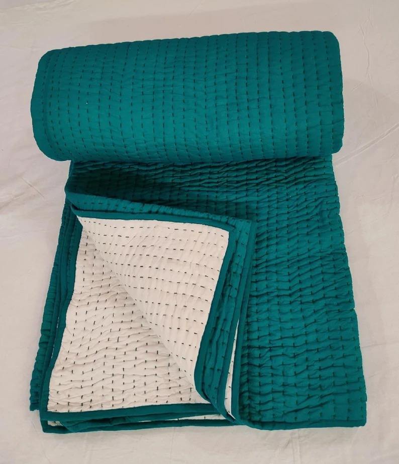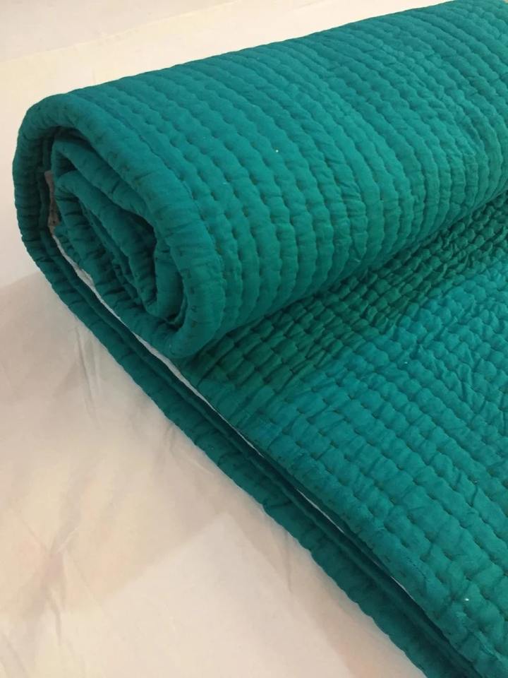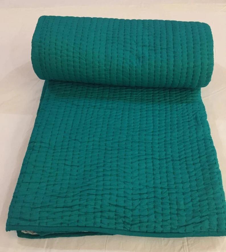 Plain Teal Green 100% Cotton Indian Handmade Quilt, Kantha Bedcover Cotton Blanket Throw, , King Queen Twin