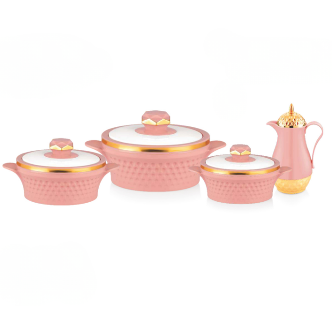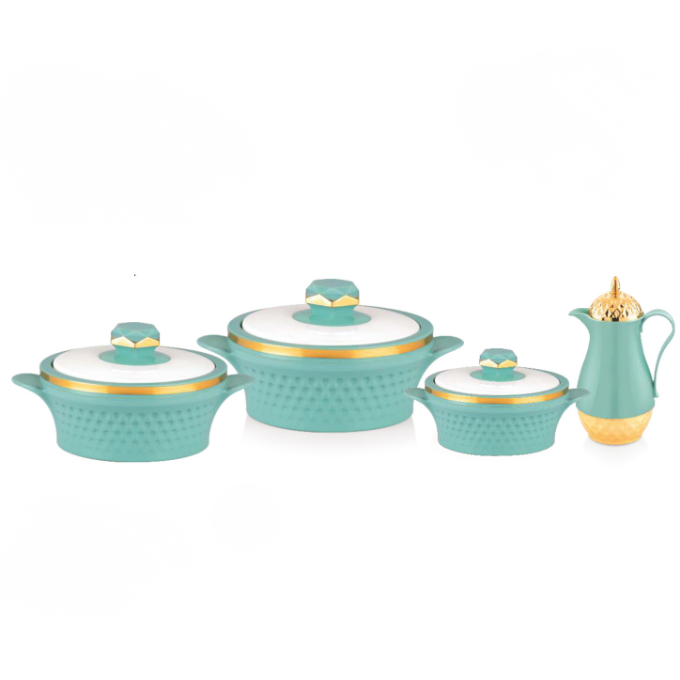 Contents- 9 pcs:Casseroles- 3 pcs, Flask- 1 pc, Spoon- 2 pcs, Dinner Plate- 3 plates