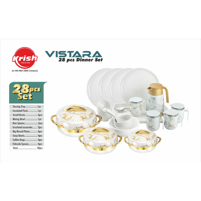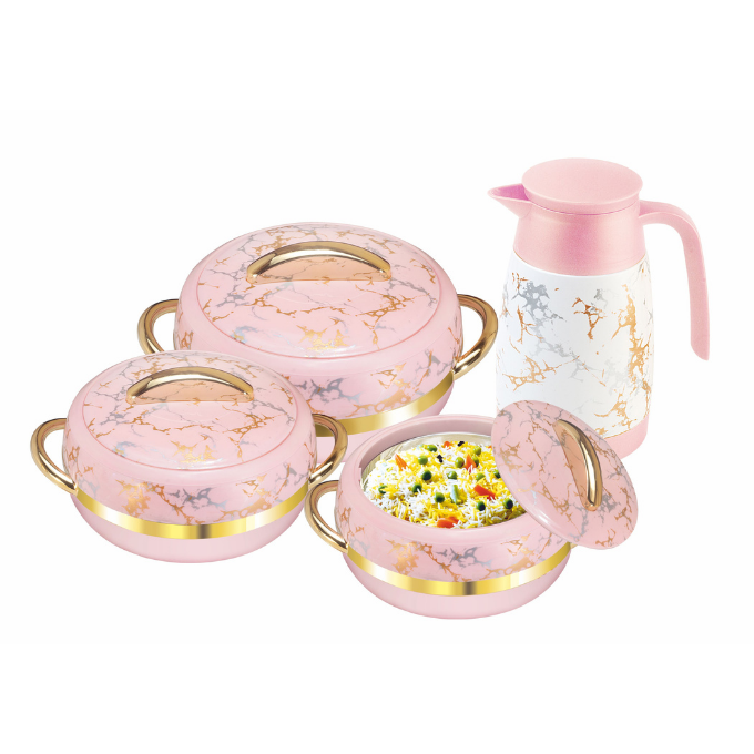 Contents- 9 pcs:Casseroles- 3 pcs, Flask- 1 pc, Spoon- 2 pcs, Dinner Plate- 3 plates