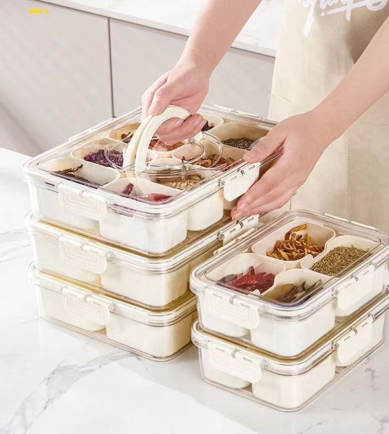 Plastic Snack & Vegetable Tray Storage Box with Divider Lid Sealed Household Kitchen Seasoning Storage Kitchen Supplies