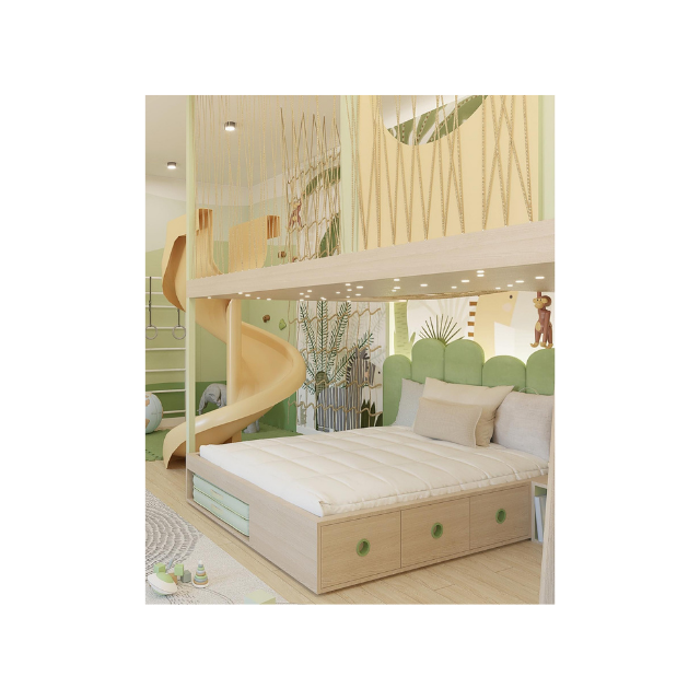 Playground Interior cozy indoor play environment with soft slides and climbing pads.