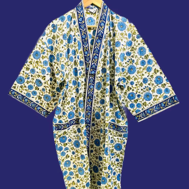 Plus Size Bohemian Floral Kimono Wrap Robe Blue Floral Print Long Lightweight Spa Robe Gift