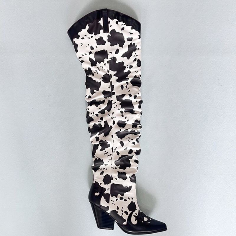 Pointy Toe Cow Print Design High Chunky Heel Boots Loose Leisure Over Knee High Booties Women Patchwork Denim Shoes Mixed Color