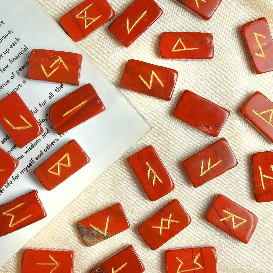 Polished Rectangular Red Jasper Rune Stones - Spiritual Crystal Kit for Beginners & Experts - Engraved Elder Futhark Alphabets