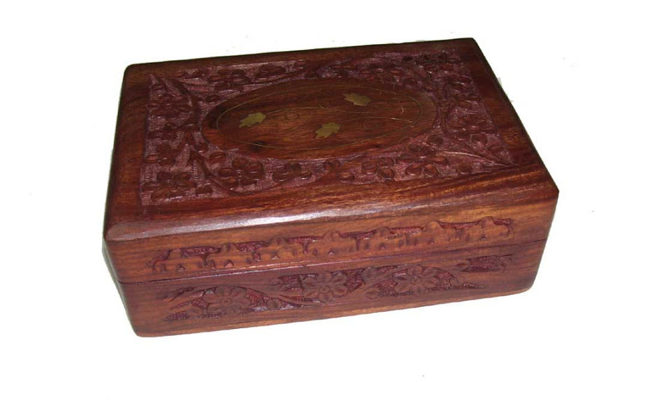 Polished Teak Wooden Box Hand Carving Brass Inlay 7"x5"x2.5" Vintage Storage Box for Jewelry, Keepsakes & Gifts
