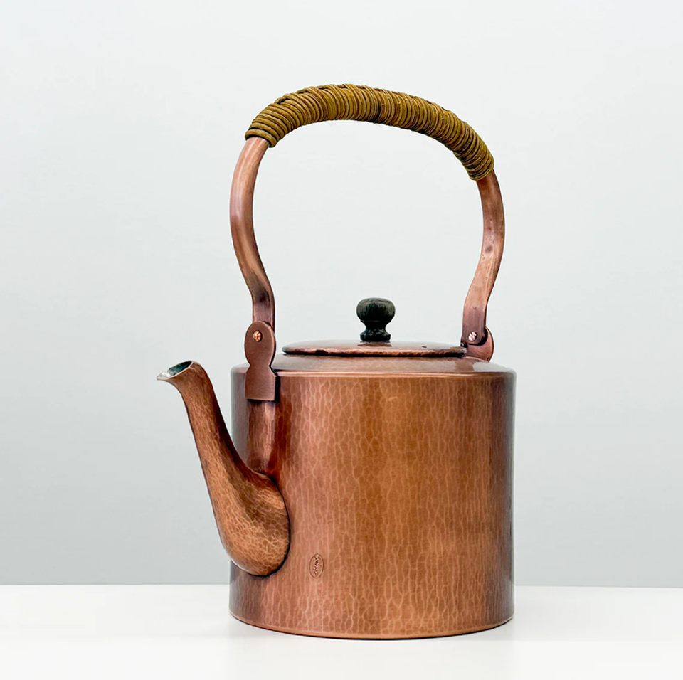 Polished copper teapot with porcelain handle, floral pattern, unique kitchenware, available at wholesale prices.
