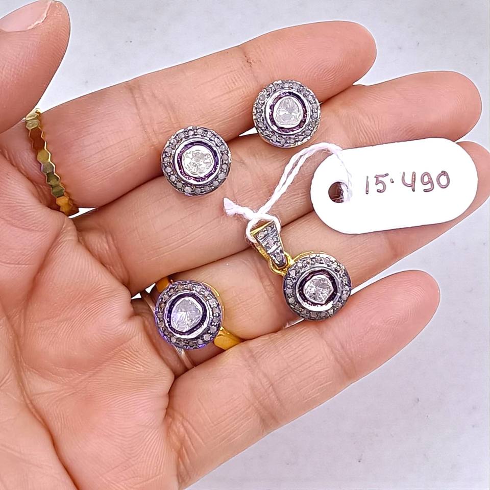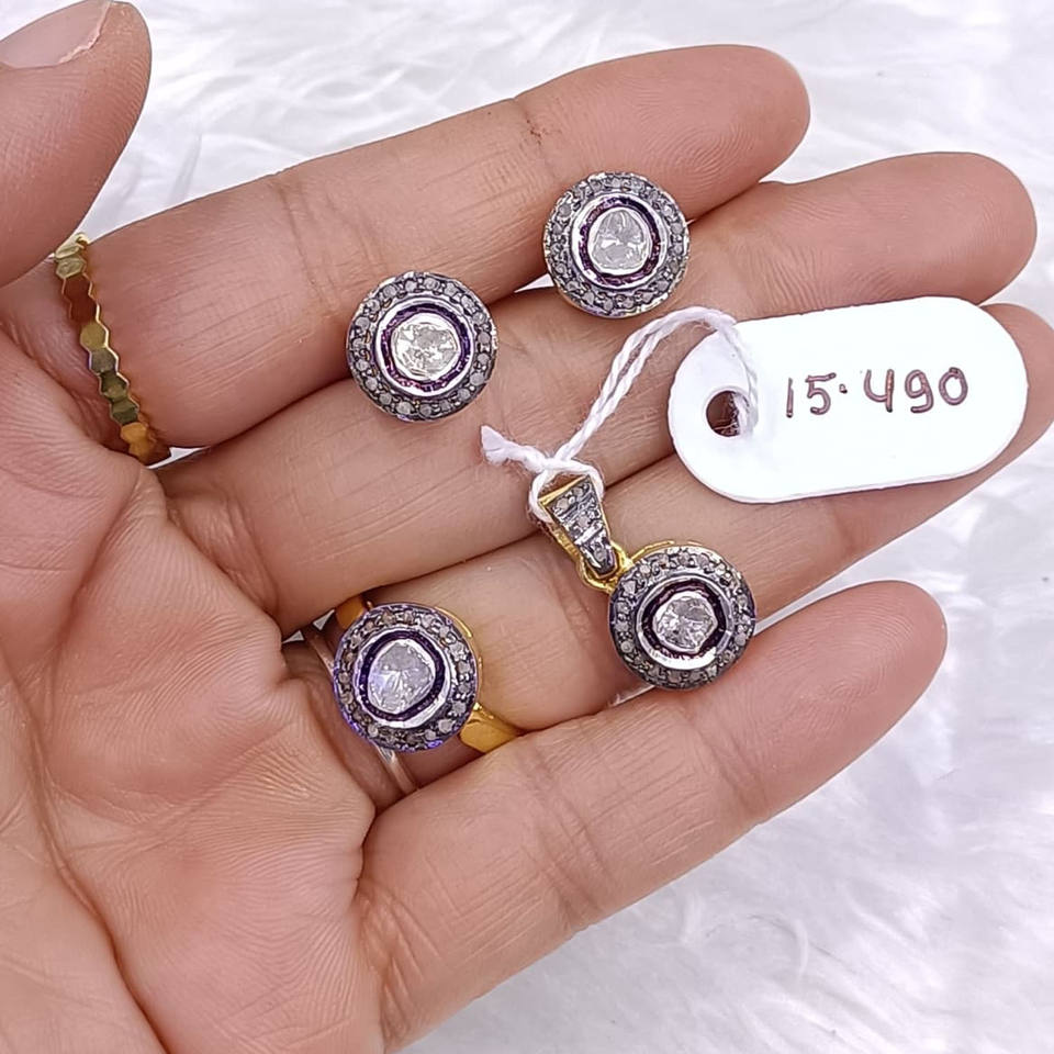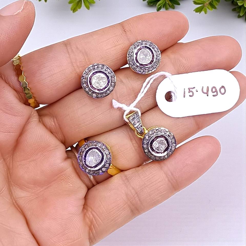 Polki Gemstone Diamond Set 925 GoldPlated Silver Handcrafted Jewelry Set