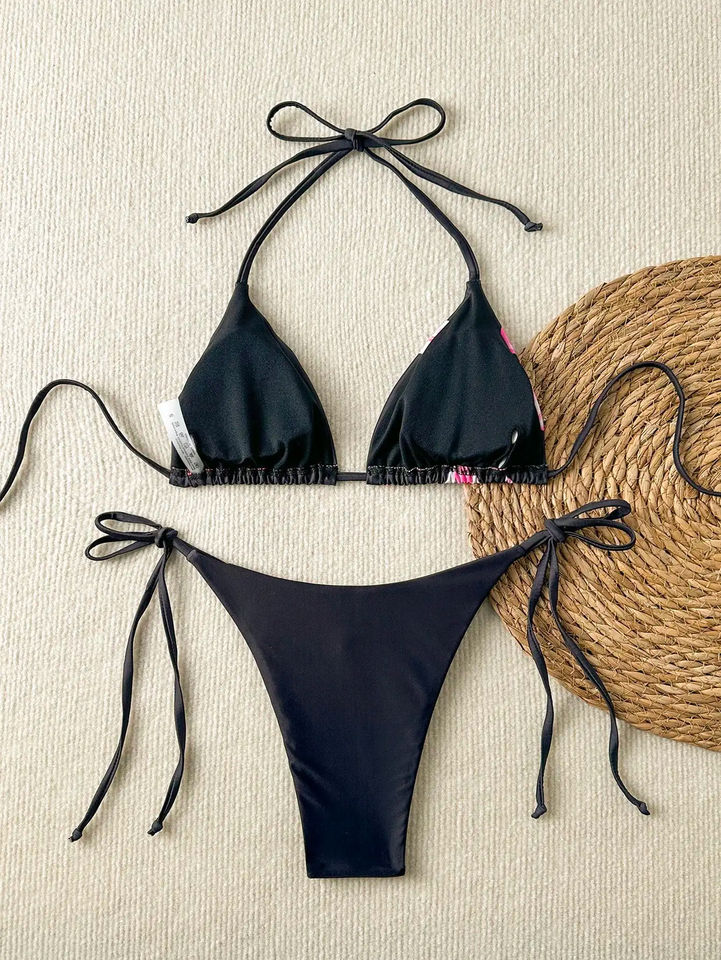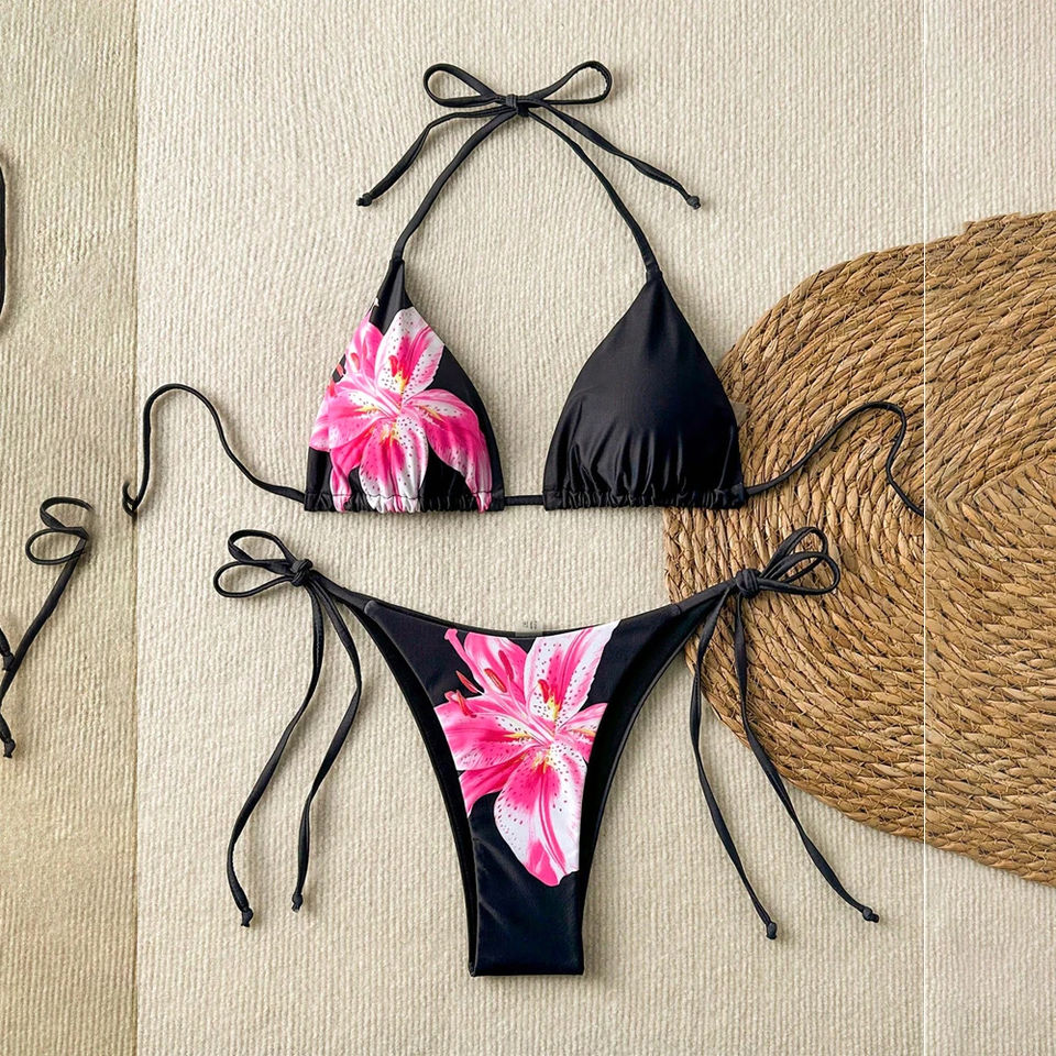 Polyester Spandex Black Plus Size Tankini Pink Flower Print Women's Adjustable Tie Side Two Piece Quick Dry Breathable Front