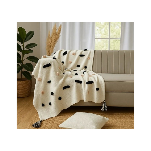 Pompom Cream Lightweight Bamboo Linen Blend 50x70in Soft Drape ISO 9001 India For Buyers Seeking Easy Use Everyday Lounge Throw